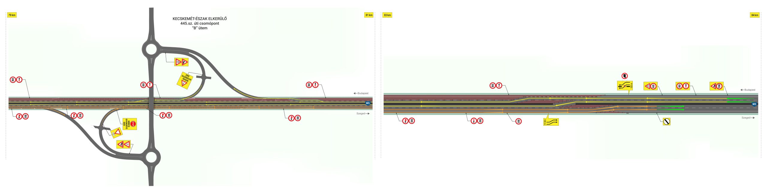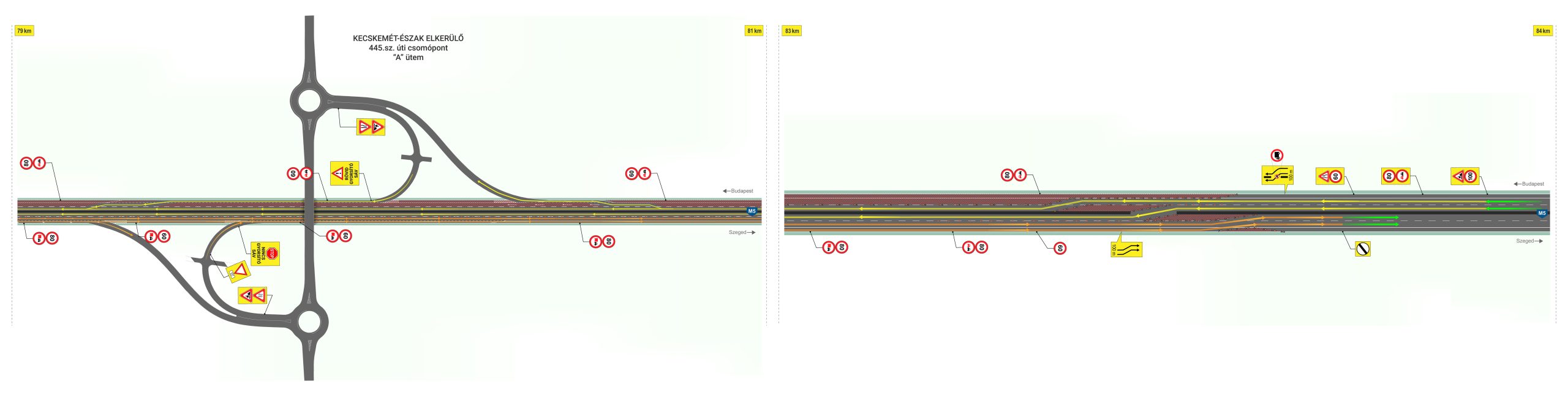 2026. április 13. és 25. között az autópálya Szeged felé vezető oldalán a 80-as és a 86-os kilométerszelvények között a burkolatfelújítási munkálatok ideje alatt a forgalmat ideiglenesen az előző sávba és részlegesen a haladó sávba terelik, így biztosítva az autópályán a kétszer két sávot a forgalom számára. A 86-os kilométerszelvényben található Kecskemét nyugat csomópontban az autópályára fel lehet hajtani, azonban az autópályáról történő lehajtás csökkentett hosszon biztosított a forgalom részére.